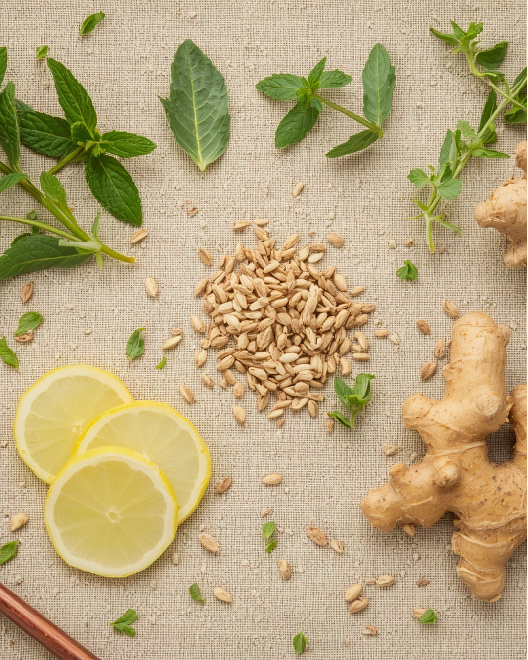 A soothing, anti-gas, anti-acid digestive rescue blend for uncomfortable bloating and sluggish digestion.
